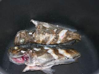 3. 锅中再加油,放入黑鱼块、姜片、葱段,翻炒至黑鱼变色。